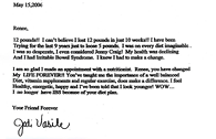 I am writing today to thank you for giving me back my life. Before I met you I was nearly 200 pounds, unhappy, depressed and only thinking things would get worse. My complexion was sallow with deep, dark circles under my eyes. My joints ached, I was tired and I had no motivation to participate in any type of exercise.